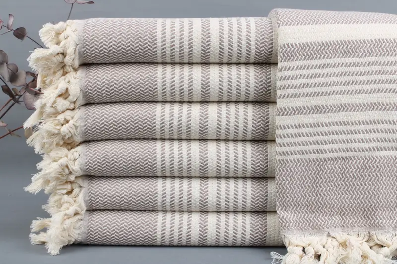 Characterized by high absorbency, each towel is woven from organic Turkish cotton on looms, ensuring a natural and soft texture. Resulting in a dimensional specification of 40x71 inches or 100x180 centimeters, these towels have a weight of 420 grams with a tolerance of ± 2" or 5 centimeters due to the hand-weaving process.