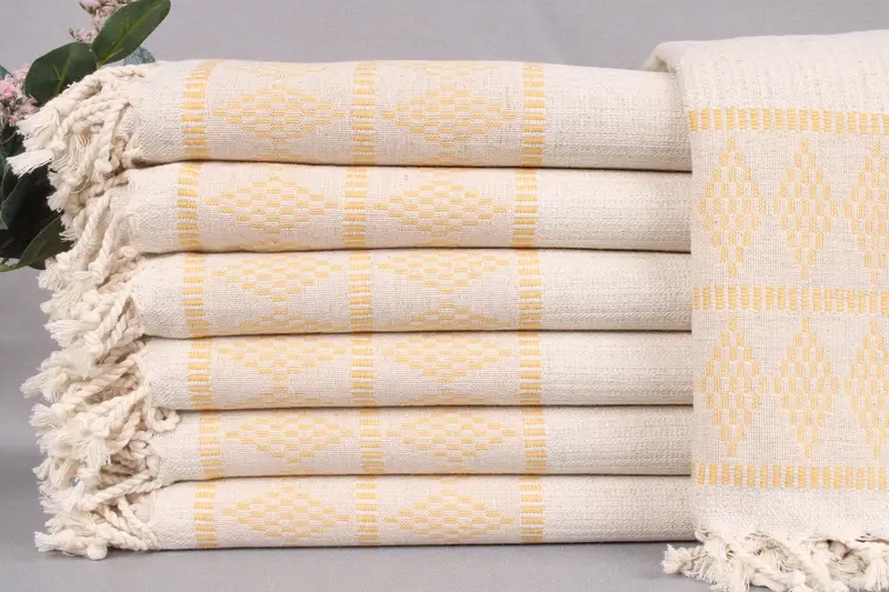 Turkish beach towels are crafted from organic Turkish cotton, ensuring superior absorbency and durability. Characterized by a size of 36x71 inches or 90x180 centimeters with a weight of 480 grams, these towels are meticulously hand-woven. The tolerance in dimensions is ± 2 inches or 5 centimeters due to manual craftsmanship.