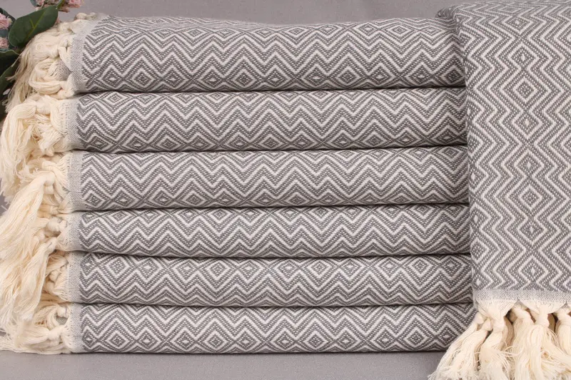 Each Turkish towel is woven from organic Turkish cotton, ensuring a high-quality, soft texture that becomes more absorbent with each wash. The towels are handmade on looms, resulting in a precise dimension of 38x71 inches (95x180 cm) with a tolerance of ±2 inches (5 cm). These hand-woven towels weigh approximately 300 grams, characterized by a weight that guarantees durability and comfort.