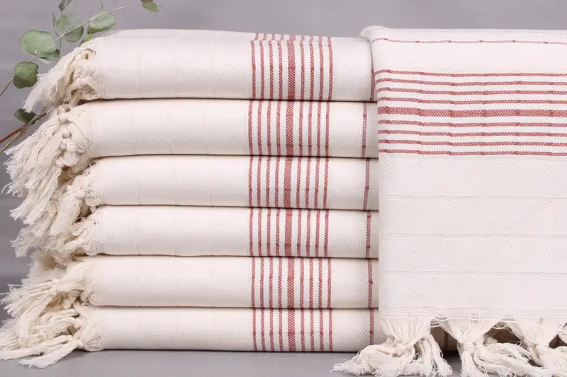 Organic Turkish cotton characterizes the fabric of these towels, ensuring exceptional absorbency and durability. Measuring 40x71 inches or 100x180 centimeters, the towels weigh approximately 370 grams. Hand weaving results in a tolerance of ± 2 inches or 5 centimeters.