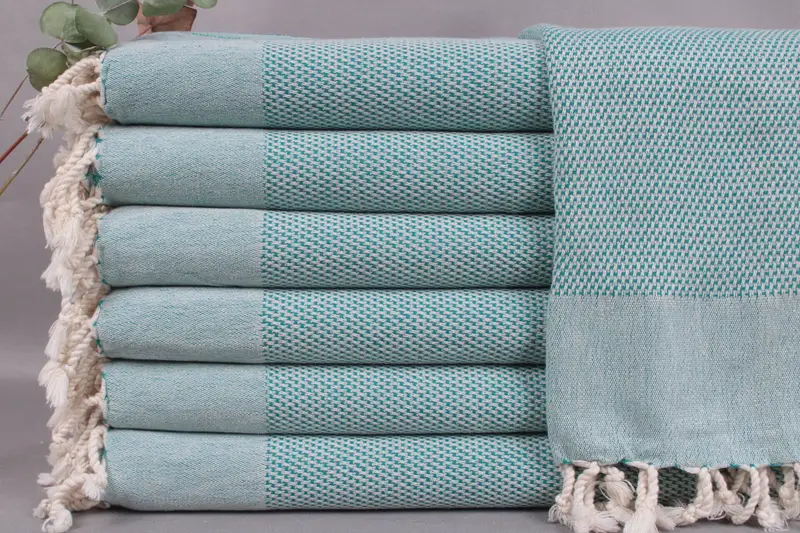 Organic Turkish cotton characterizes these hand towels, ensuring high absorbency and softness. The towels, measuring 24x44 inches or 60x110 centimeters, weigh approximately 150 grams. Weaving tolerances result in size variations of ± 2 inches or 5 centimeters.