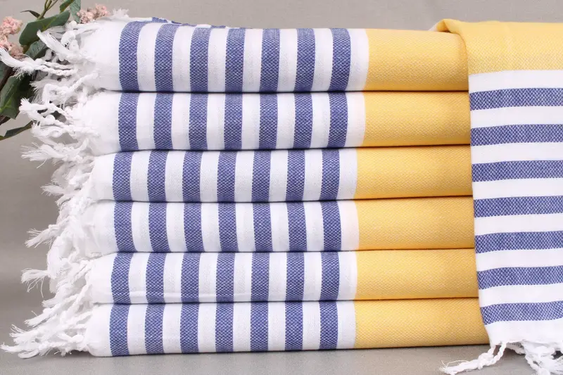 Woven from organic Turkish cotton, these towels exhibit high absorbency and durability, ensuring longevity and quality. Resulting in a product characterized by soft texture and efficient water retention. Dimensions of the towels are 40x71 inches or 100x180 centimeters, weighing 280 grams. The hand-weaving process allows for a tolerance of ± 2" or 5cm in size.