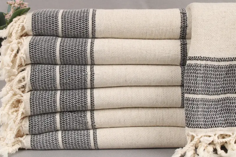 Crafted from organic Turkish cotton, the beach towels are woven by hand on looms, ensuring high quality and absorbency. Each towel measures 36x71 inches (90x180 centimeters) with a tolerance of ±2 inches (5 centimeters) due to weaving techniques. Weighing 430 grams, they are designed to provide durability while maintaining softness.