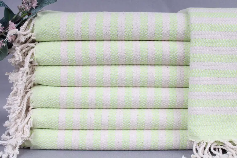 Characterized by high absorbency, the Turkish towels are woven from organic Turkish cotton, ensuring superior quality and softness. Resulting in a weight of 440 grams per piece, the towels have dimensions of 40x71 inches (100x180 centimeters), with a tolerance of ± 2 inches (5 centimeters). Crafted through hand-weaving on looms, each towel offers unique precision while maintaining a uniform size.