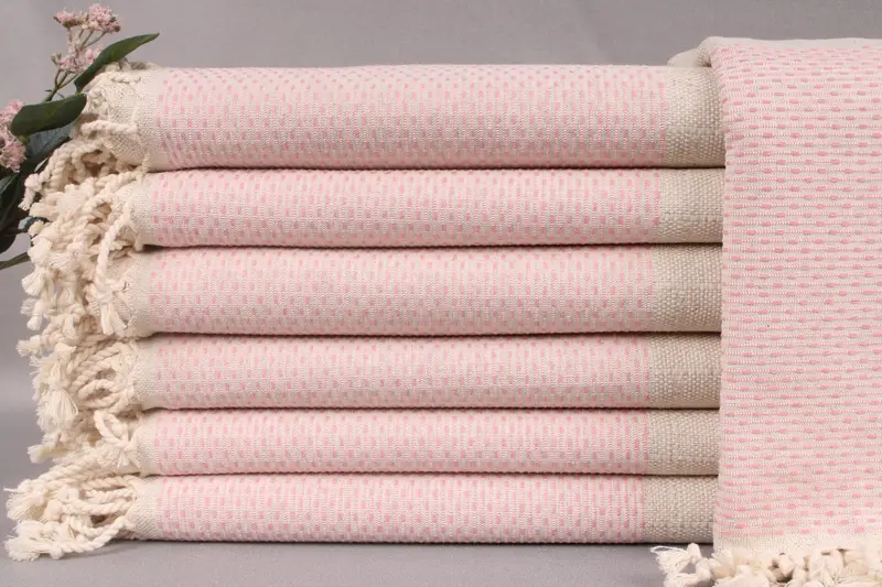 Woven from organic Turkish cotton, the towels exhibit exceptional absorbency and durability. Resulting in a soft texture, these towels are characterized by their 40x71 inches or 100x180 centimeters dimensions, weighing approximately 480 grams. The hand-weaving process ensures slight tolerances of ± 2" or 5 centimeters.