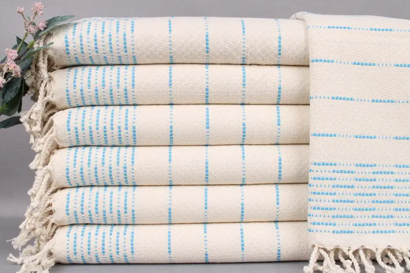 Ensuring durability and breathability, the towels are woven from organic Turkish cotton, characterized by their light weight of 140 grams. Resulting in a luxurious hand-feel, the towels measure 18x36 inches or 45x90 centimeters, with a weaving tolerance of ± 2 inches or 5 centimeters. Personalization is an available option, featuring embroidery or monogramming.