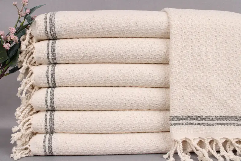 Fiber composition assures optimal absorbency, utilizing Turkish cotton, as evidenced by the 18x38 inches product dimension. Weighing 120 grams, the handwoven towel exhibits a margin of error of ± 2 inches or 5 centimeters due to manual production. Embroidery customization is available for personalization, where specific design details are to be provided by the purchaser.