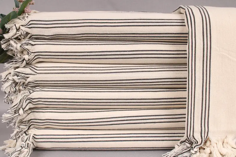 The beach towel is woven from organic Turkish cotton, ensuring high absorbency and durability. Each towel measures 40x71 inches or 100x180 centimeters, with a weight of 300 grams, resulting in a lightweight yet robust design. Hand-weaving tolerances can result in size variations of up to ± 2 inches or 5 centimeters.