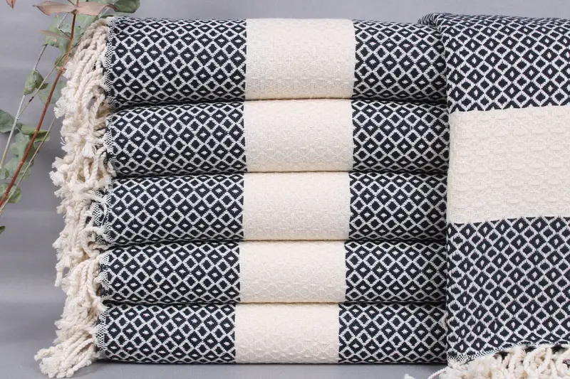 Organic Turkish cotton weaves these towels, ensuring high absorbency and softness. Each piece is meticulously hand-woven on traditional looms, measuring 40x71 inches or 100x180 centimeters, with a weight of 400 grams. Weaving tolerances may result in a size variation of ±2 inches or 5 centimeters.