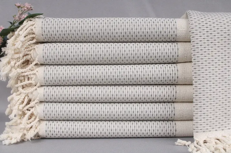 Turkish beach towels are woven from organic Turkish cotton, ensuring superior absorbency and softness. Each towel measures 40x71 inches or 100x180 centimeters, weighing approximately 480 grams. Tolerances in size may be ± 2 inches or 5 centimeters due to hand weaving.