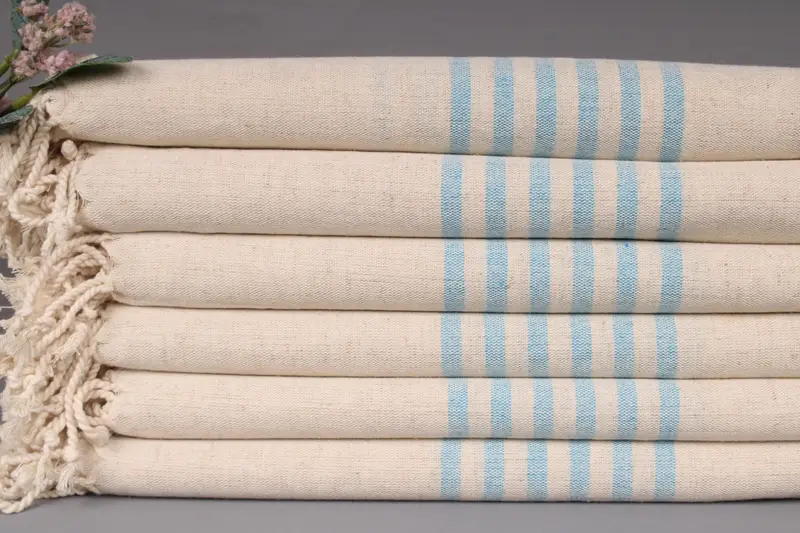 Turkish towels are characterized by their fiber composition, including organic Turkish cotton, ensuring superior absorbency and softness. Each towel measures 36x67 inches or 90x170 centimeters, weighing approximately 250 grams. The hand-woven nature of these towels allows for a tolerance of ±2 inches or 5 centimeters in size, resulting in a slight variation.