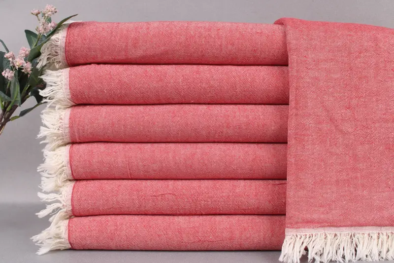 All Turkish towels and bedspreads are woven from Organic Turkish Cotton, ensuring a high-quality, soft, and absorbent textile product. Characterized by a weight of 100 grams and dimensions of 24x40 inches or 60x100 centimeters, these items have a tolerance of ± 2 inches or 5 centimeters due to hand-weaving.