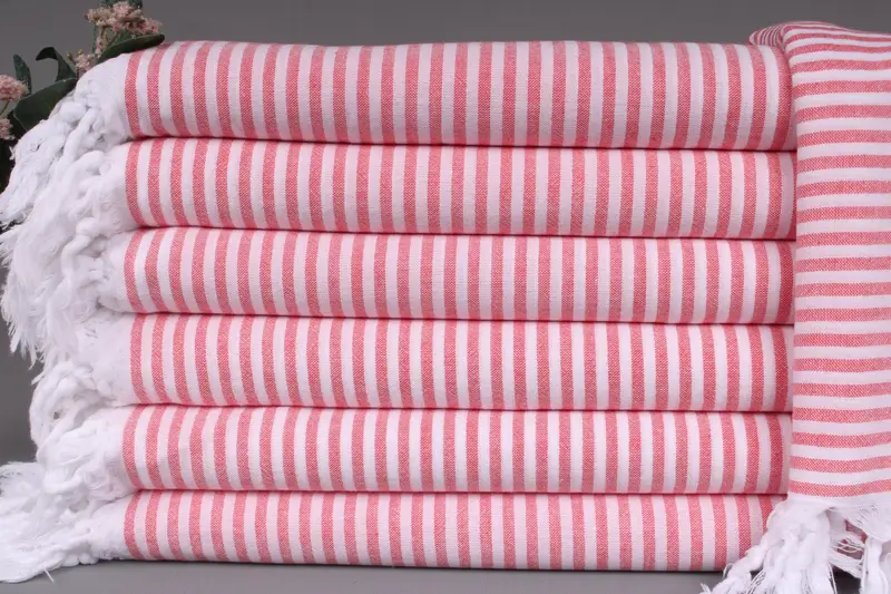 Woven from organic Turkish cotton, these towels are characterized by their superior absorbency and durability. Resulting in a soft and comfortable texture, these towels are hand-woven on looms, ensuring each piece is unique. Dimensions are 36x67 inches or 90x170 centimeters, with a weight of 200 grams. The hand-weaving process allows for a tolerance of ±2 inches or 5 centimeters in the final product.