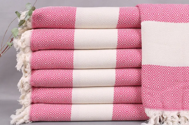 The Turkish beach towels are woven from organic Turkish cotton, ensuring high absorbency and durability. Each towel measures 40x71 inches or 100x180 centimeters, weighing approximately 420 grams. Tolerances in size are ± 2 inches or 5 centimeters due to hand-weaving techniques.