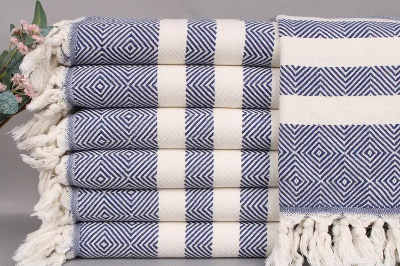 Hanging kitchen hand towels are characterized by their fiber composition and absorbency. Ensuring a soft, comfortable texture, these towels are made from Turkish cotton. Resulting in a lightweight yet durable product, they measure 20x32 inches (50x80 centimeters) and weigh 100 grams. Hand-weaving tolerances permit variations of ± 2 inches or 5 centimeters.