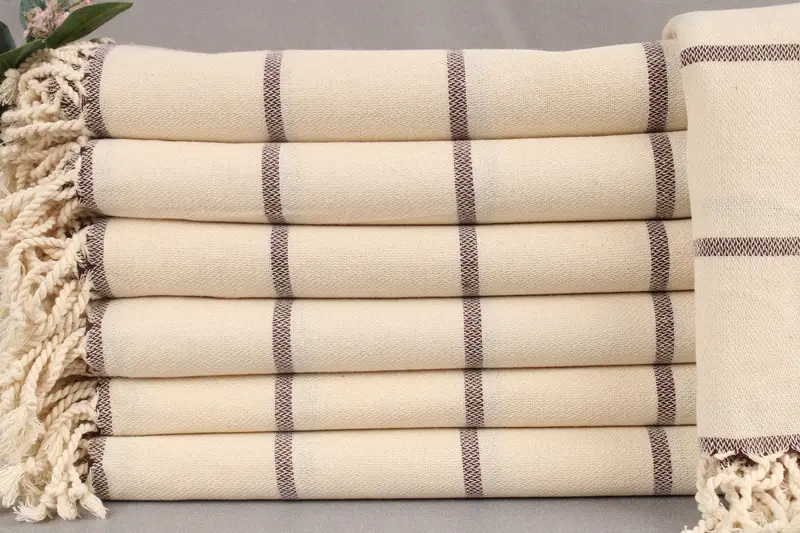 Our Turkish beach towels are made from organic Turkish cotton, characterized by their natural fiber composition and excellent absorbency. Each towel measures 38x67 inches or 95x170 centimeters with a tolerance of ± 2 inches or 5 centimeters. Weighing 340 grams, these towels are hand-woven, ensuring high quality and consistency.
