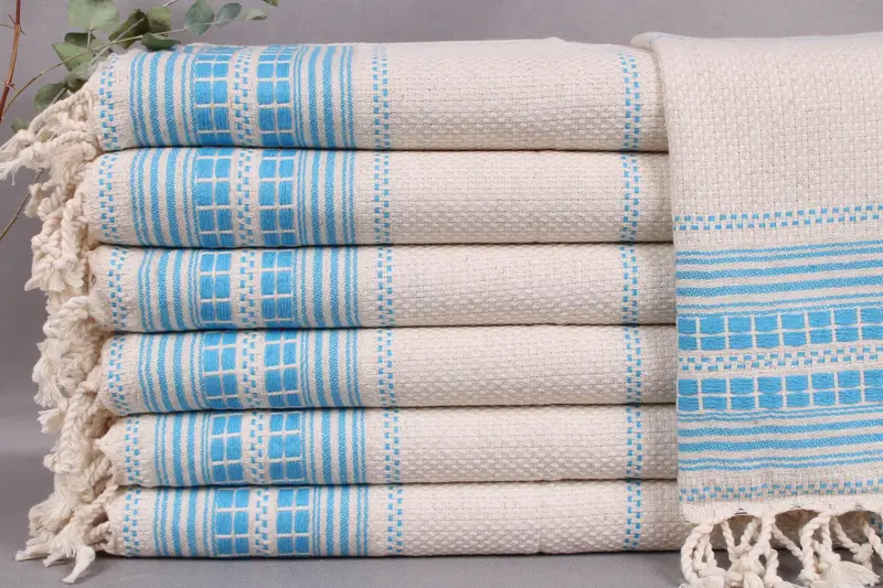 Organic Turkish cotton characterizes these hand towels, ensuring a natural fiber composition that is both durable and hypoallergenic. Each towel is woven by hand, resulting in a product that is not only unique but also exhibits consistent absorbency. The dimensions measure 20x40 inches or 50x100 centimeters with a tolerance of ±2 inches or 5 centimeters, ensuring precision in size.