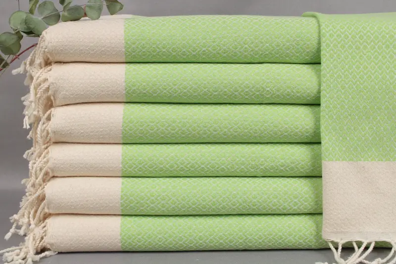 The towels are woven from organic Turkish cotton on looms, ensuring a high-quality product characterized by their soft texture and durability. Each towel measures 20x40 inches (50x100 cm) and weighs approximately 122 grams, with weaving tolerances of ±2 inches or 5 cm. These towels are meticulously handwoven, resulting in precision despite minor variations.