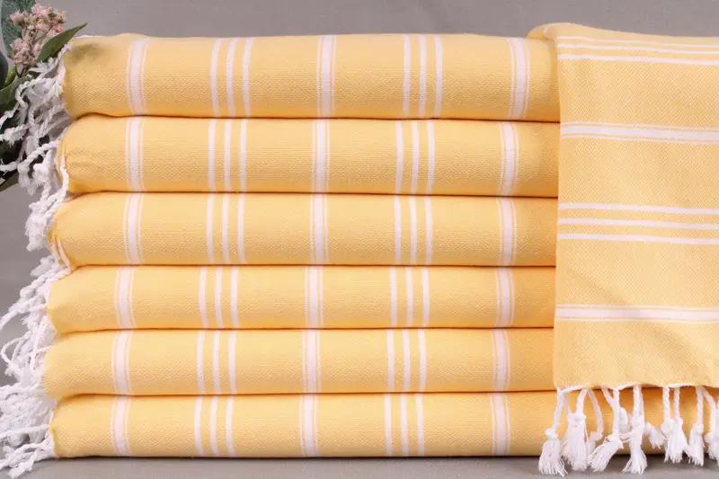 Turkish towels are fabricated from organic Turkish cotton, ensuring high absorbency and durability. These beach towels, hand towels, or blankets are meticulously hand-woven on looms, resulting in dimensions of 24x40 inches or 60x100 centimeters. The weight is 100 grams, with a tolerance of ± 2 inches or 5 centimeters due to the hand-weaving process.