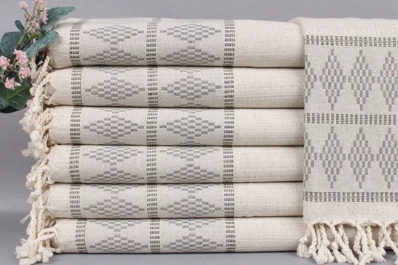 These hand towels are woven from organic Turkish cotton, resulting in a durable and absorbent product. Characterized by a sub-category of wedding gifts and a secondary color of beige, each towel measures 20x40 inches or 50x100 centimeters with a tolerance of ±2 inches or 5 centimeters. Weighing 120 grams, each piece is hand-woven on looms to ensure quality.