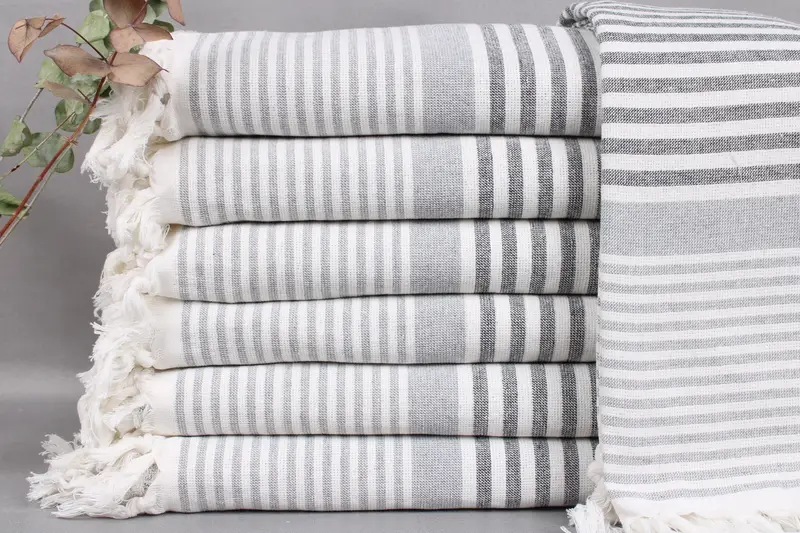 All beach towels, small towels, and throws are woven from organic Turkish cotton on looms, ensuring high-quality craftsmanship. These dimensions are 40x67 inches or 100x170 centimeters, characterized by a tolerance of ±2 inches or 5 centimeters due to hand-weaving, resulting in a weight of 430 grams per piece. Each item can be personalized with embroidery or monogrammed options, including specific letters, names, or logos, with an optional pre-shrink treatment.