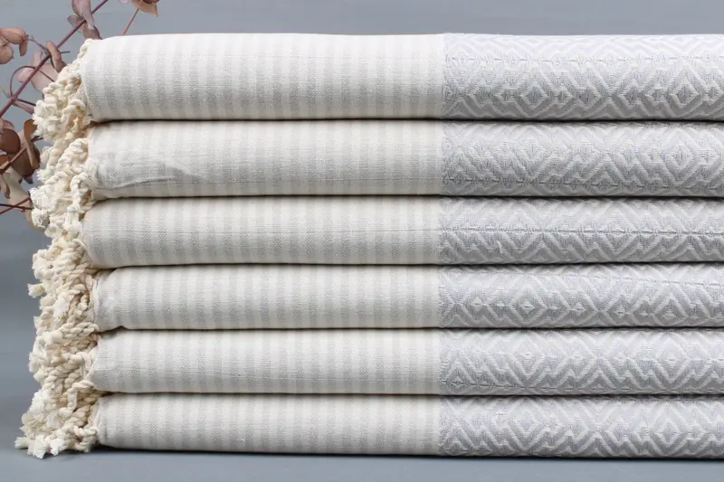 Turkish towels are woven from organic Turkish cotton, ensuring high absorbency and durability. Resulting in dimensions of 40x70 inches (100x180 centimeters) with a weight range of 425-475 grams, they exhibit a weaving tolerance of ±2 inches or 5 centimeters. Customization includes embroidery or monogramming, adhering to specified placement guidelines. Towels are pre-shrunk, enhancing durability and usability. Orders exceeding 35 USD qualify for free worldwide shipping via FedEx or DHL Express, delivering in 2-5 business days. Return and exchang...
