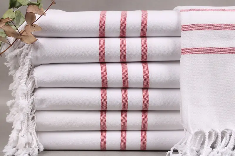 Organic Turkish cotton characterizes the towels, ensuring high absorbency and durability. Each towel measures 40x71 inches or 100x180 centimeters, weighing 420 grams with a tolerance of ±2 inches or 5 centimeters due to hand-weaving. The towels are customizable via embroidery, allowing personalization with letters, names, or logos, with detailed placement and design choices provided.