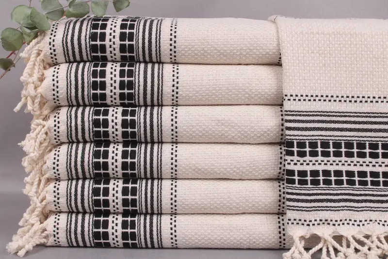 Fiber composition for the towels includes organic Turkish cotton, ensuring high absorbency and durability. Characterized by traditional hand-weaving techniques, these towels measure 20x40 inches (50x100 centimeters) and weigh approximately 120 grams. Variations of ±2 inches (5cm) are possible due to the weaving process.