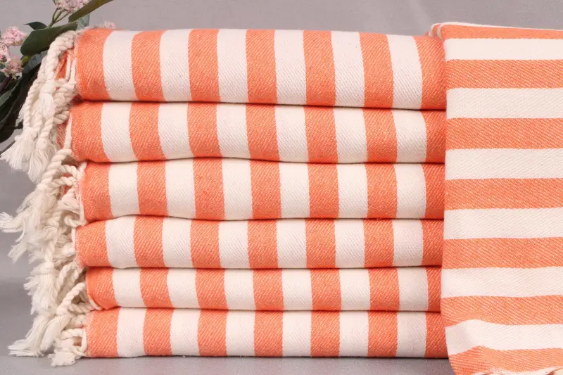 Each towel is woven from organic Turkish cotton, ensuring soft and absorbent fabric. Dimensions span 36x79 inches or 90x200 centimeters, weighing 340 grams, with a ± 2-inch or 5-cm tolerance due to hand-weaving. Towels can be personalized with embroidery, enabling customization with letters, names, or logos.