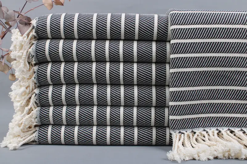 Turkish towels are composed of organic Turkish cotton, ensuring high absorbency and durability. Characterized by their dimensions of 40x70 inches or 100x180 centimeters, these towels typically weigh between 425-475 grams. Hand-weaving results in size tolerances of ±2 inches or 5 centimeters.