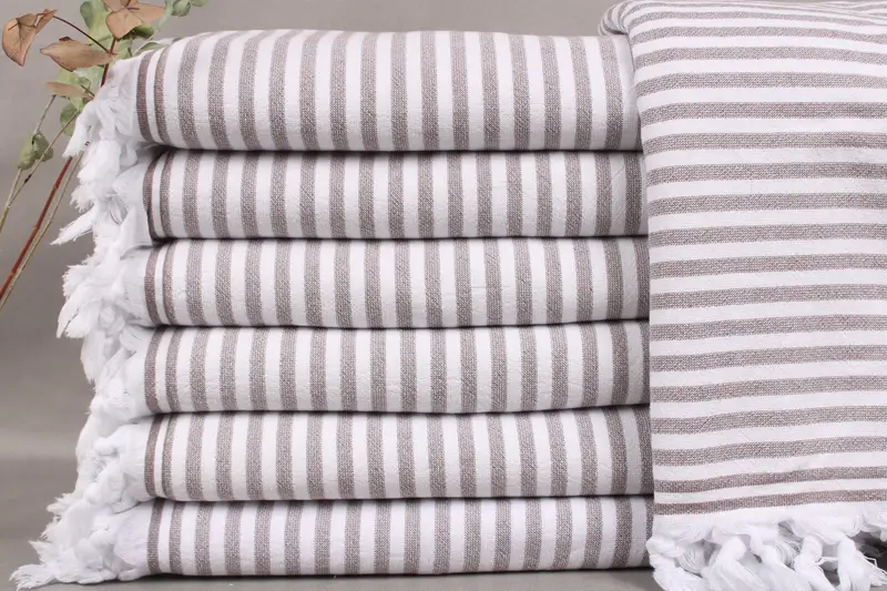 Beach towels are woven from organic Turkish cotton, ensuring a soft and sustainable fabric choice with excellent absorbency. Characterized by dimensions of 36x71 inches or 90x180 centimeters, these towels weigh approximately 400 grams with a tolerance of ± 2 inches or 5 centimeters due to hand-weaving techniques. Each product listing includes customization options such as embroidery of letters, names, or logos, with delivery choices based on order value and geography.