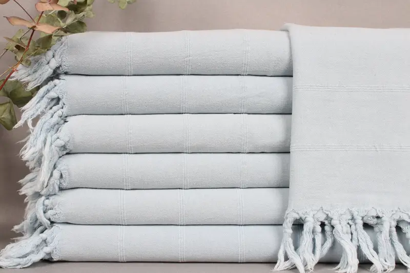 The Turkish towels, hand towels, and blankets are woven from organic Turkish cotton on looms and are handmade. This composition ensures excellent absorbency and quality. The towels measure 22x36 inches or 55x90 centimeters, weighing approximately 144 grams. The tolerance for size variations is ± 2 inches or 5 centimeters due to the hand-weaving process.