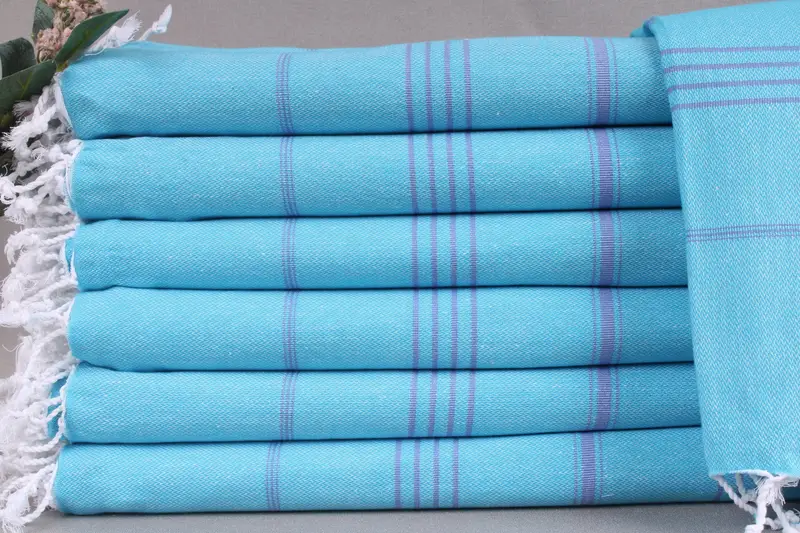 Weaving techniques ensure the Turkish cotton beach towels are handmade from organic materials, resulting in a robust and absorbent product. Measuring 40x71 inches or 100x180 centimeters, each towel weighs approximately 260 grams. Weaving tolerances allow for variations of ±2 inches or 5 centimeters.