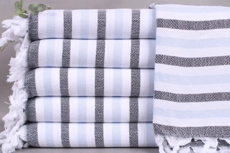 Characterized by its use of organic Turkish cotton, the Turkish beach towel is woven meticulously by hand on looms, resulting in a unique, artisanal product. Each towel measures 40x63 inches (100x160 cm) and weighs 380 grams, with a weaving tolerance of ± 2 inches (5 cm). The hand-weaving process ensures each towel adheres to precise specifications, creating a durable yet soft textile.
