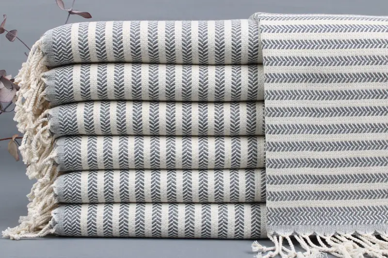 Turkish cotton towels, ensuring absorbency and softness, are woven from Organic Turkish Cotton on looms, resulting in 18x40 inches or 45x100 centimeters towels with a tolerance of ± 2 inches or 5 centimeters. Weighing 114 grams, these towels are characterized by hand-weaving that may cause minor dimensional variations. Customization options include embroidery or name placement, with pre-wash softening noted for enhanced texture.