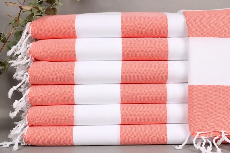 Each towel in this collection is woven from organic Turkish cotton, ensuring durability and high absorbency. Resulting in soft, absorbent fabrics, these towels are ideal for varied uses. Characterized by their dimensions of 24x40 inches or 60x100 centimeters, these towels weigh 100 grams with a hand-weaving tolerance of ±2 inches or 5 centimeters.