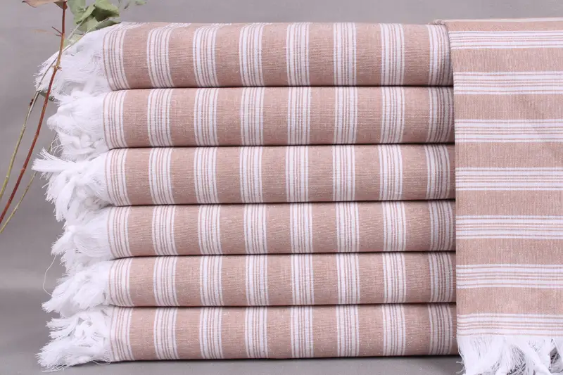 Characterized by their organic Turkish cotton construction, the towels ensure superior absorbency and softness, maintaining freshness with each use. Each towel measures 40x71 inches or 100x180 centimeters, with a weight of 210 grams, exhibiting a hand-weaving tolerance of up to ± 2 inches or 5 centimeters. Personalization options allow for embroidery or monogramming, ensuring the towels are pre-shrunk before delivery.