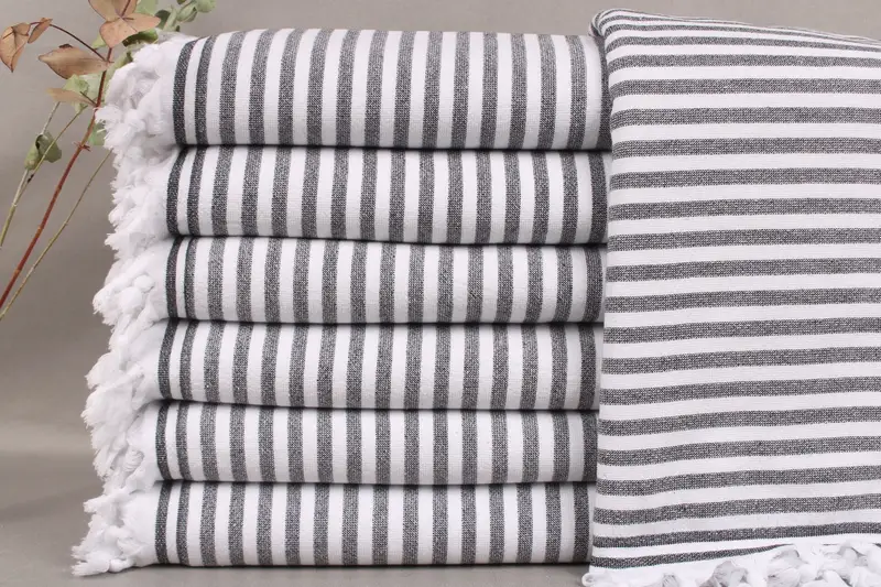 Each towel, blanket, or hand towel is woven from Organic Turkish Cotton, resulting in a soft and durable product. The towels measure 36x71 inches or 90x180 centimeters, weighing 400 grams. Weaving tolerances are ±2 inches or 5 centimeters.