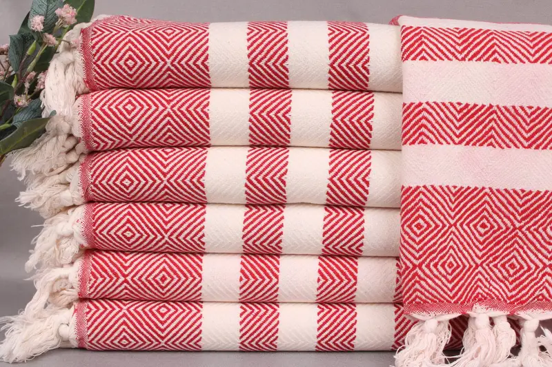 The towels are woven from organic Turkish cotton on looms, ensuring a high-quality, absorbent product. Characterized by their 20x32 inches or 50x80 centimeter dimensions, these towels weigh 100 grams. Hand-woven with a tolerance of ± 2" or 5cm, each product's size may vary slightly.