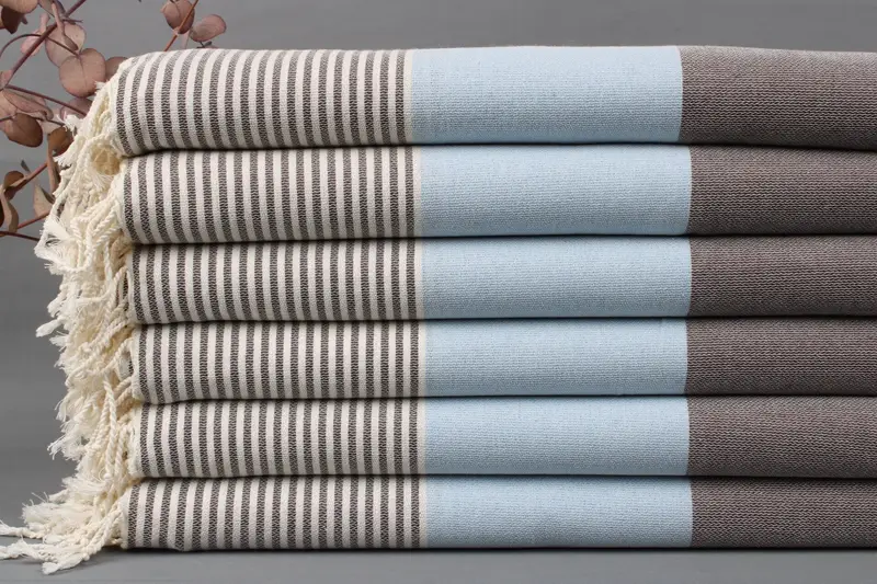 Turkish towels are woven from organic Turkish cotton, ensuring a highly absorbent and durable fabric. Resulting in towels that measure 40x67 inches or 100x180 centimeters with a tolerance of ±2 inches or 5 centimeters. The weight ranges between 425-475 grams per towel.
