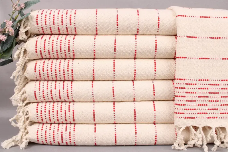Organic Turkish cotton ensures high-quality fiber composition and excellent absorbency, characterized by its meticulous hand-weaving process. The towels measure 18x36 inches (45x90 centimeters) and weigh 140 grams, with allowable tolerances of ± 2 inches or 5 centimeters due to manual weaving. Embroidery customization allows personalization with letters, names, or logos in specified fonts, colors, and positions, ensuring a pre-shrunk status post-first wash.