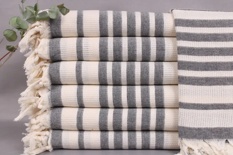 Each towel is made from organic Turkish cotton, ensuring high absorbency and softness. Characterized by a measurement of 34x71 inches (85x180 centimeters) and weighing 320 grams, the towels offer a certain tolerance of ±2 inches or 5 centimeters due to hand-weaving. Resulting in personalized options, including embroidery or monogramming, these towels may be pre-shrunk to maintain their form and fit.