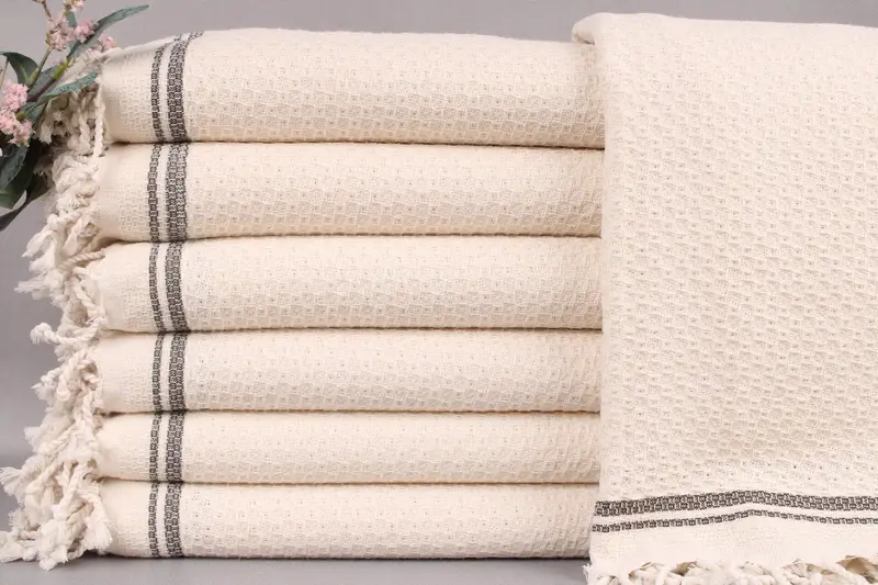 Woven from organic Turkish cotton, the towels are characterized by high absorbency and durability, ensuring their effectiveness for diverse applications. Each towel is 67x36 inches or 170x90 centimeters, weighing 440 grams, with weaving tolerances of ±2 inches or 5 centimeters. Customization options include embroidery with personalized letters, names, or logos, specifying the font, color, and placement.