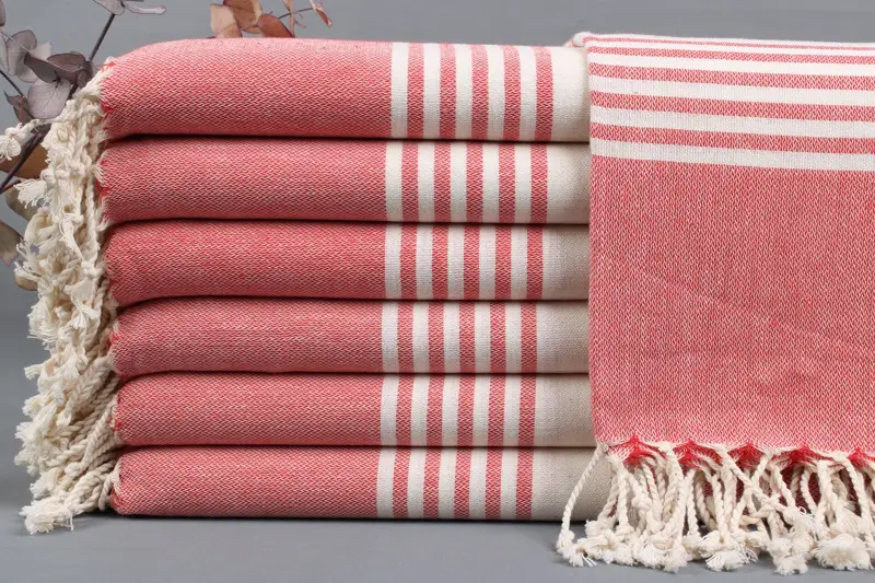 Organic Turkish cotton characterizes these towels, ensuring superior absorbency and durability. Each piece is woven by hand, resulting in a high-quality product. Dimensions are either 40x70 inches or 100x180 centimeters, with a tolerance of ± 2 inches or 5 centimeters. These towels weigh between 425 to 475 grams, offering substantial comfort.