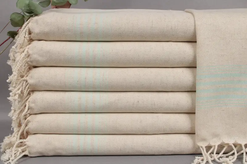 All listed towels are woven from organic Turkish cotton, ensuring high absorbency and durability. Resulting in an heirloom quality product, these towels are characterized by their 18x36 inches (45x90 cm) dimensions and a weight of 104 grams. The towels exhibit a permissible weaving tolerance of ± 2 inches or 5 cm.