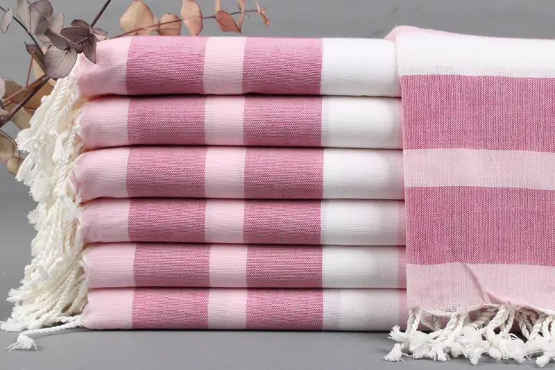 Turkish towels are woven from organic Turkish cotton on traditional looms, ensuring quality and durability. Resulting in towels that weigh between 425-475 grams, each measuring 40x75 inches (100x180 centimeters) with a permissible deviation of ±2 inches or 5 centimeters due to hand-weaving techniques. Additionally, these items are pre-shrunk and can be customized with embroidery, with shipping available globally for orders over 35 USD through FedEx or DHL Express.