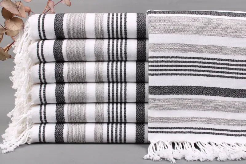 Turkish Towels consist of 100% organic Turkish cotton, ensuring high absorbency and durability. Characterized by their dimensions of 40x70 inches or 100x180 centimeters, these towels typically weigh between 425-475 grams. Hand-weaving results in a tolerance of ±2 inches or 5 centimeters.
