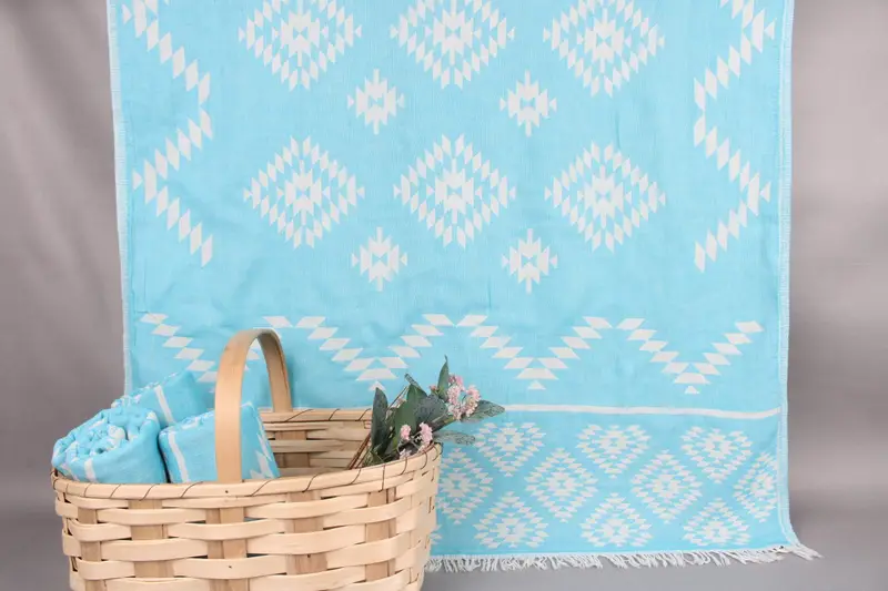 Each Embroidered Beach Towel is characterized by its organic Turkish cotton fiber composition, ensuring high absorbency and durability. Dimensions specified are 36x71 inches or 90x180 centimeters, with a weight of 320 grams. Hand-woven tolerances may result in variations of ± 2 inches or 5 centimeters.