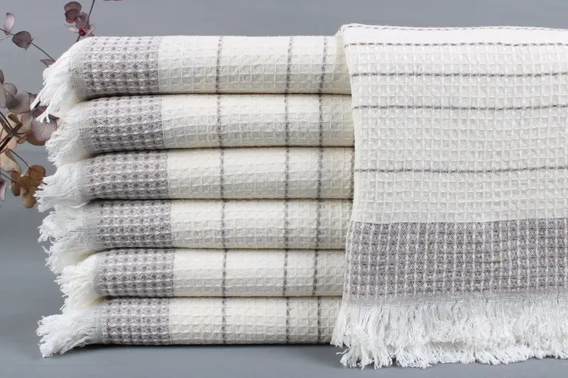 Organic Turkish cotton ensures superior absorbency and softness. Each towel or blanket measures 40x71 inches or 100x180 centimeters, with a tolerance of ±2 inches or 5 centimeters, and a weight ranging from 425 to 475 grams. Hand-weaving processes are employed, ensuring precise dimensions and a quality product.