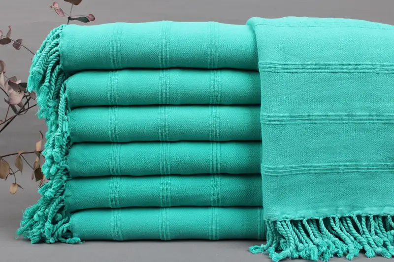 Turkish towels are woven from organic Turkish cotton, ensuring a high level of absorbency and durability. Characterized by a size of 40x70 inches or 100x180 centimeters, with a weight range of 425-475 grams, these towels are handmade with tolerances of ± 2 inches or 5 centimeters due to hand-weaving.